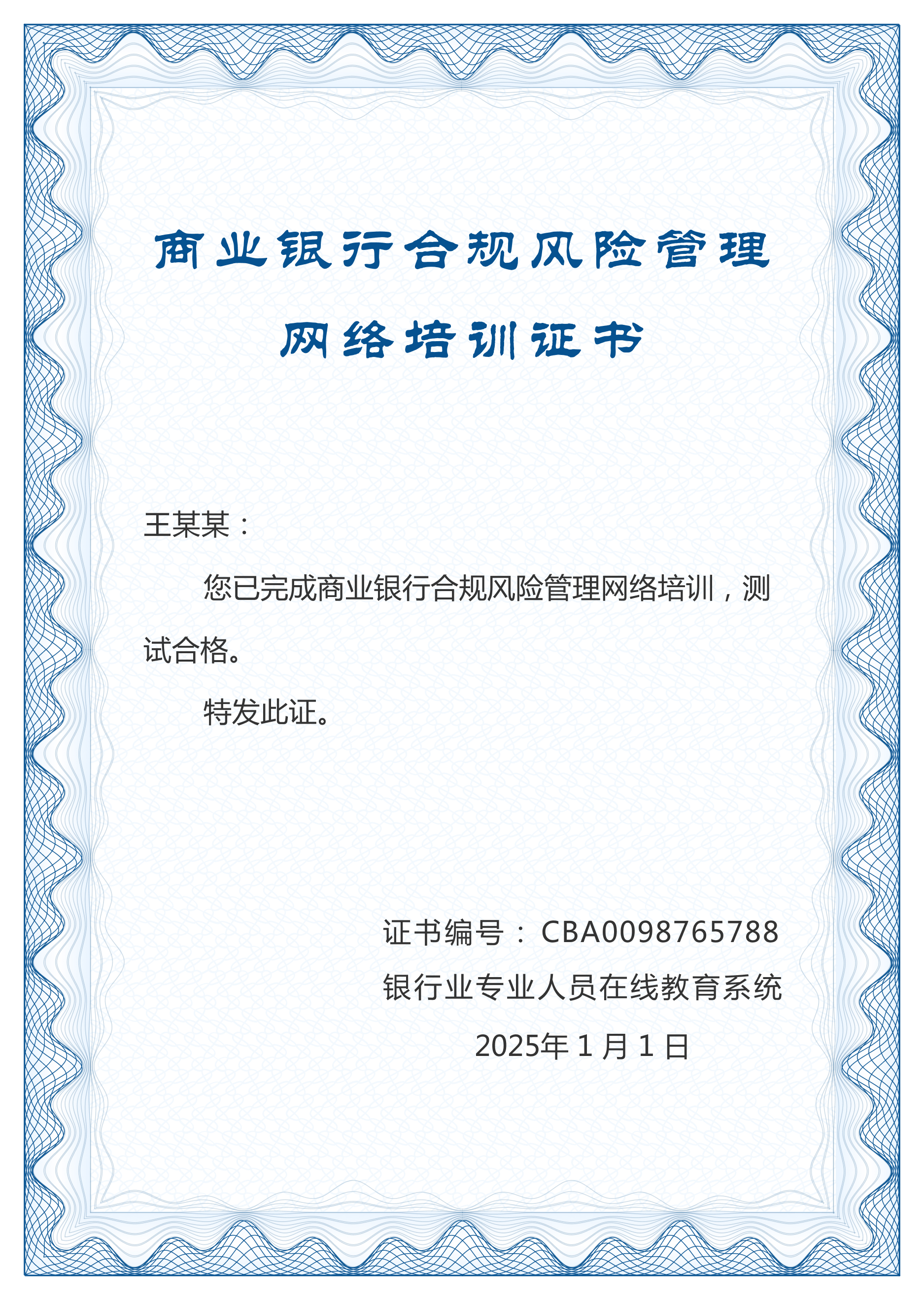 本证书课程内容介绍了当前商业银行合规管理领域面临的发展矛盾和难点,涵盖商业银行合规管理的基础篇、流程篇和实务篇三个部分,包括合规管理的背景和基础知识、流程技能与实务操作。授课通俗易懂,确保学员素能提升,达到学以致用。证书课程视频授课共计22学时,各篇附练习题若干,结业测试共计50题,包括单选题、判断题和多选题等题型。该证书课程的视频授课培训、练习及结业测试全部基于网络学习平台实现,通过结业测试可获得银行业专业人员在线教育系统颁发的商业银行合规风险管理网络培训证书。